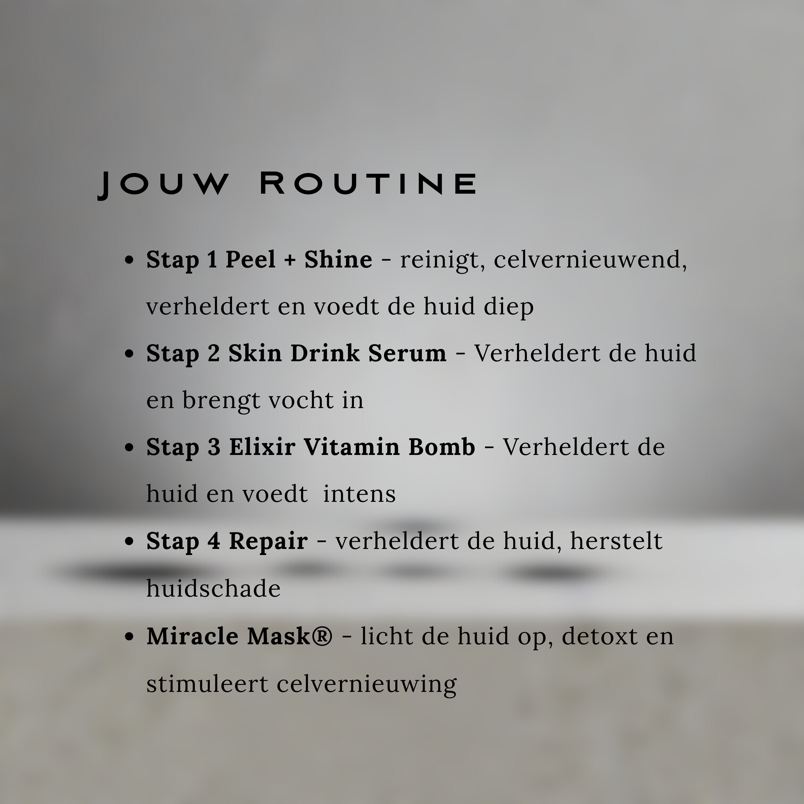 De Hyperpigment Huid Set egaliseert de teint langzaam en zichtbaar, vermindert donkere vlekjes door de huid intens te hydrateren, te voeden en dagelijks te vernieuwen. De set ondersteunt celvernieuwing, kalmeert ontsteking en versterkt de huidbarrière, waardoor pigmentvorming afneemt en de huid helderder wordt. Bij consistent gebruik krijgt de huid een gelijkmatige glow met verfijnde textuur en een frissere, jeugdige uitstraling.