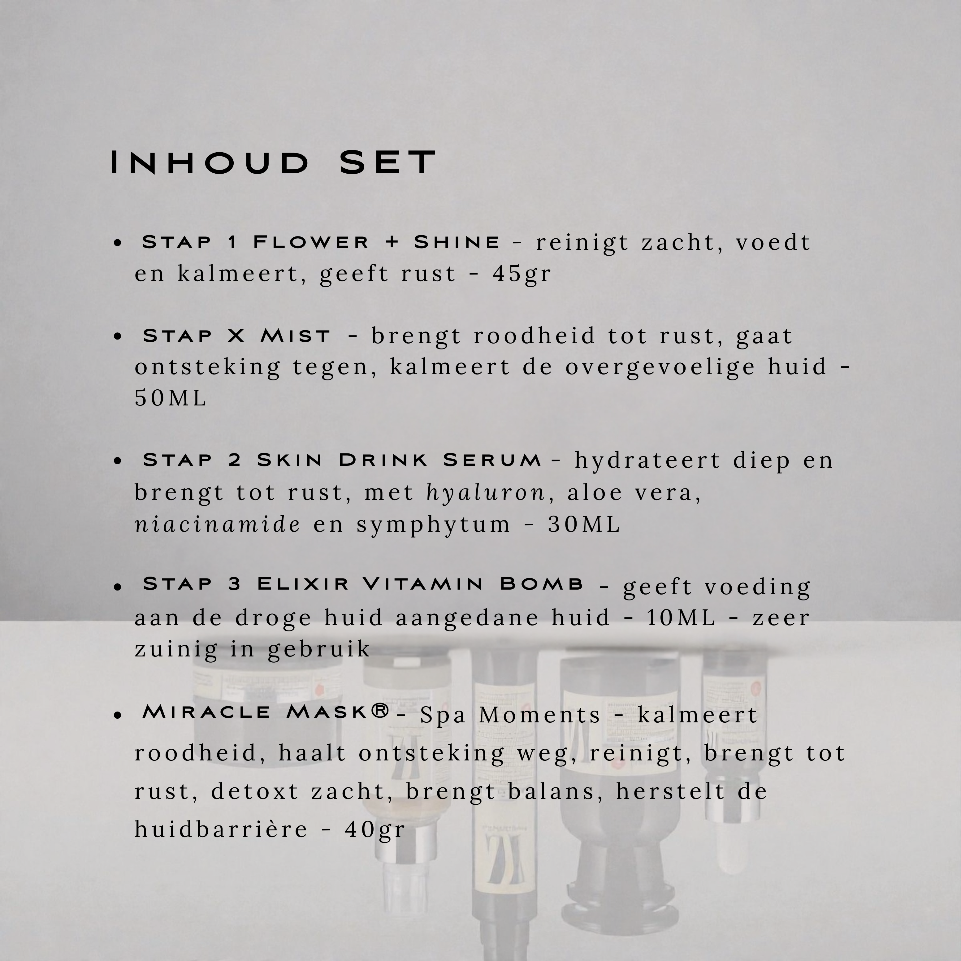 Deze zorgvuldig opgebouwde routine herstelt de huidbarrière, vermindert ontstekingsreacties en brengt de huid tot rust — zónder agressieve zuren, parfum of alcohol.