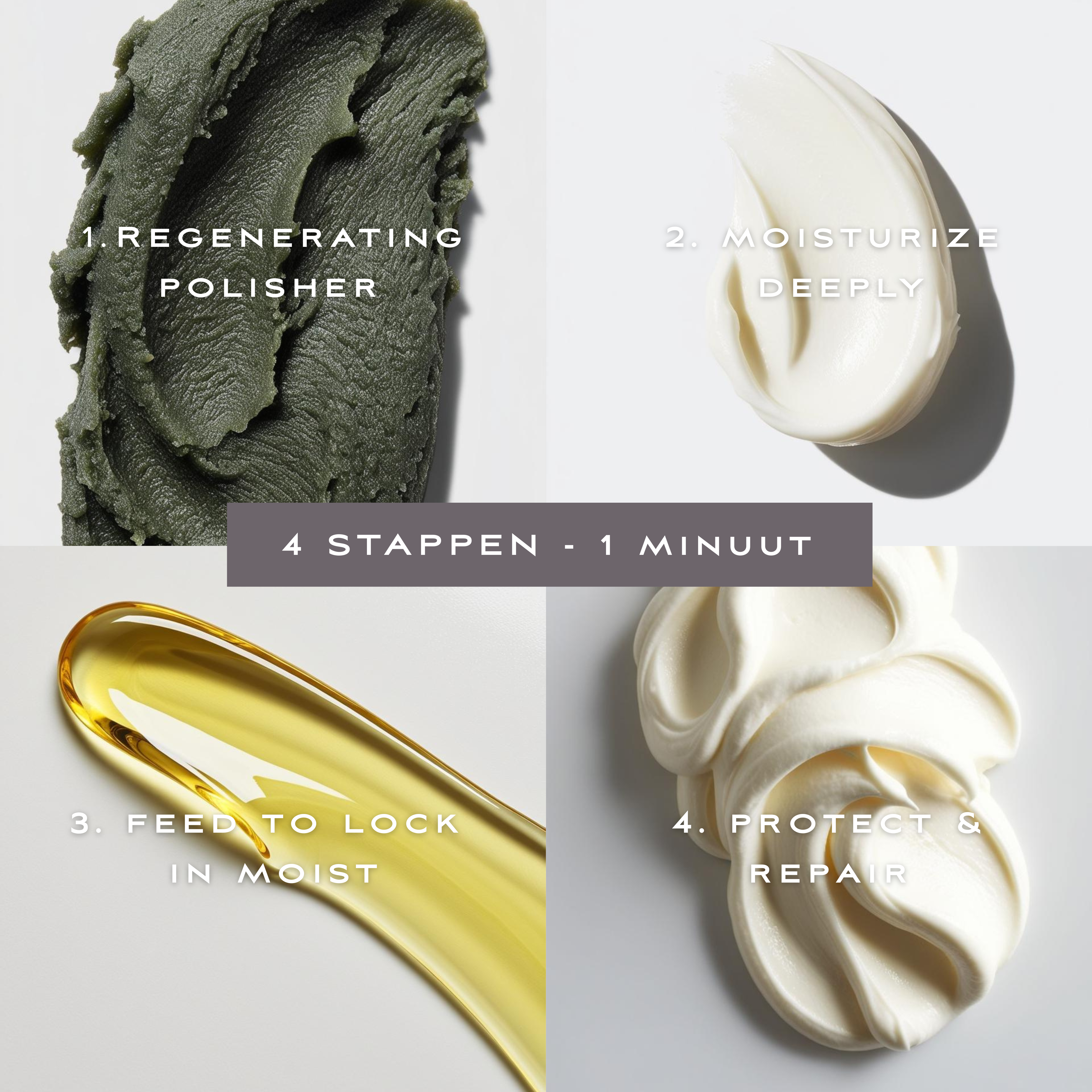 - Deze high-performing routine combineert exfoliatie, hydratatie, voeding en herstel in één harmonisch ritueel. 4 Stappen in 1 minuut.