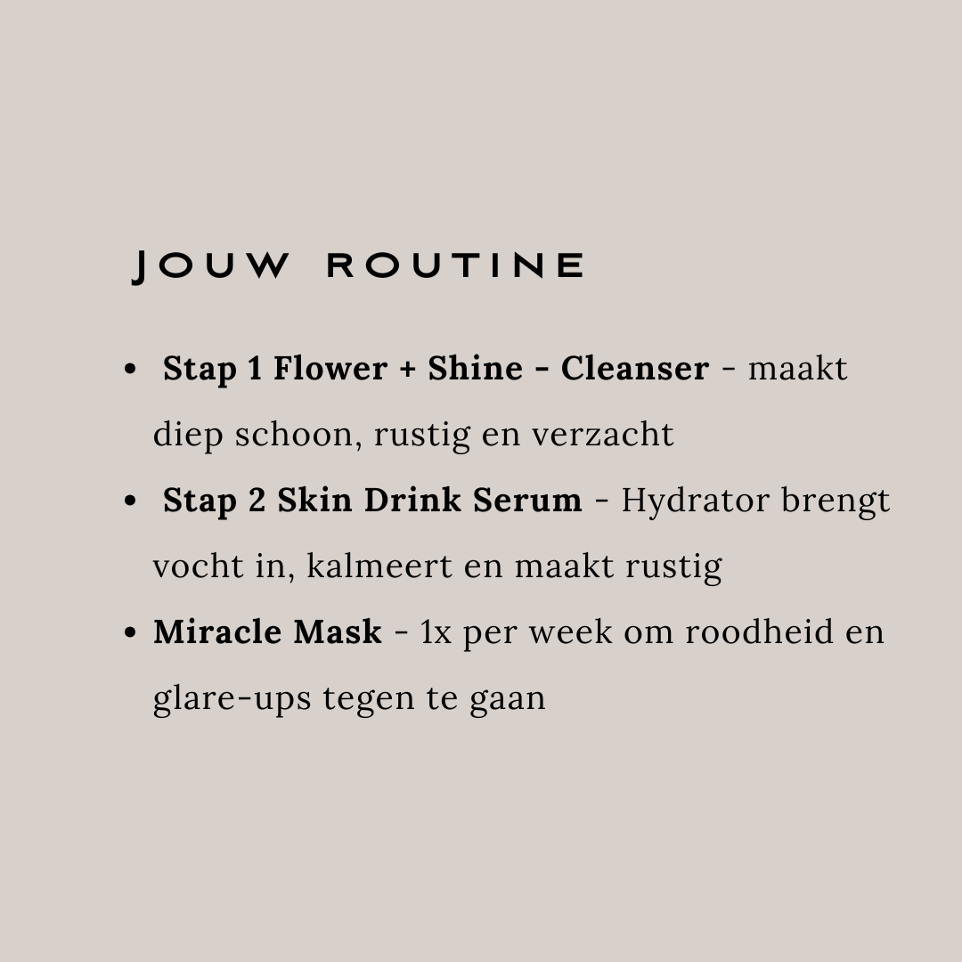 Kalmeer onmiddellijk flare-ups met een zorgvuldig samengestelde routine die hitte, roodheid en prikkeling zichtbaar vermindert. De huidbarrière herstelt, spanning daalt en je teint wordt gelijkmatiger en koeler. Perfect voor wie eindelijk controle wil krijgen over gevoeligheid, ontsteking en thermische roodheid.